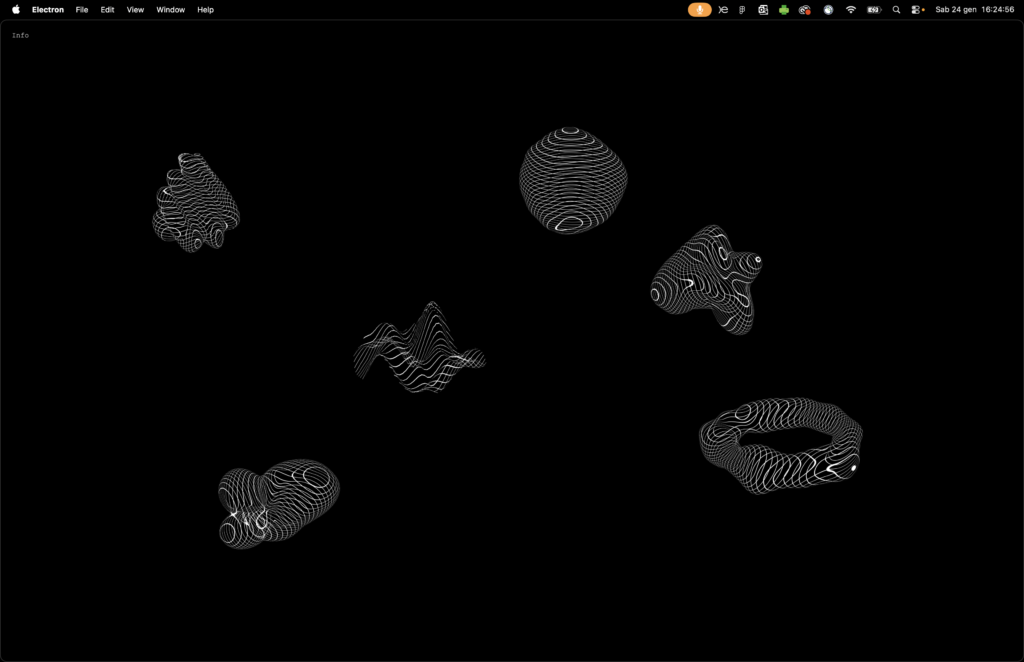 The ecosystem is composed of six organisms, each of which responds to a real phenomenon in the system (battery, CPU, RAM, brightness, sound, and network). These inputs are translated into fluid three-dimensional forms, sound emissions, and variable levels of visibility.